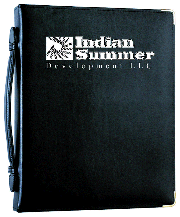 Item Information : 12 3/4" x 10 3/8" x 1 3/4" foam padded covers with sewn edges. Full zippered closure. Coordinated suedene lining on the inside. Black softhide strap handle on the spine of the cover. Pen loop. Concealed rivets. 1" three-ring metal binder (brass or nickel). Rounded metal corners (brass or nickel).