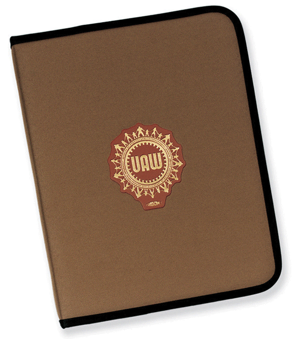 Item Information : 10 1/4" x 13 1/2" fabric or vinyl foam padded hand-stitched cover with bound edges. Interior has a sectionizer pocket. Pen loop. Writing pad included. 1-inch three ring brass metal binder.